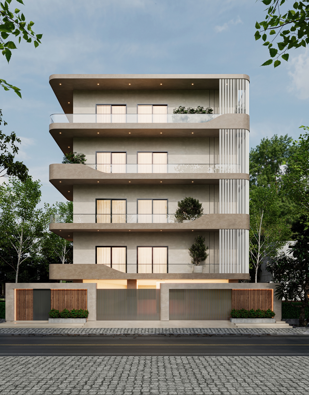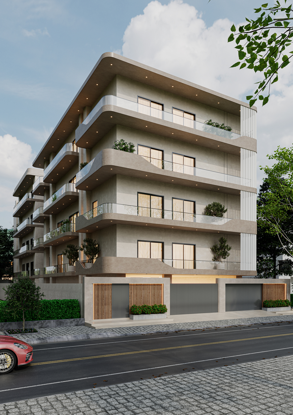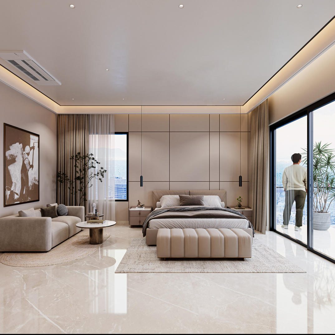 A contemporary multi-level residence that combines a clean, linear façade with deep terraces and full-height glazing to maximise views and natural light. The exterior uses soft neutral tones, layered volumes, and integrated planters to create a warm, sophisticated street presence. Inside, the apartments feature spacious bedrooms and living areas with a calm palette, indirect lighting, and sleek panelling, offering refined, comfortable everyday living.