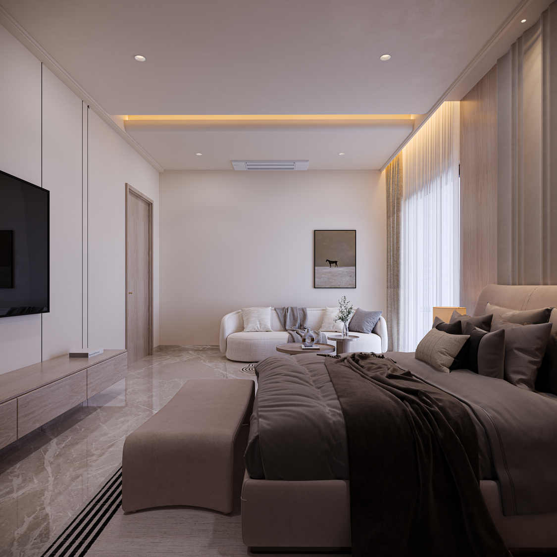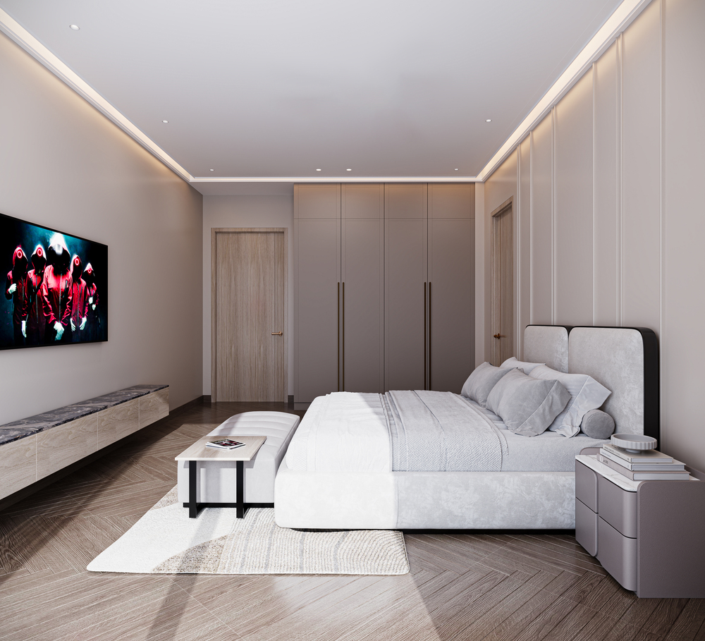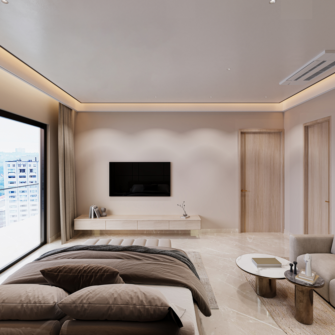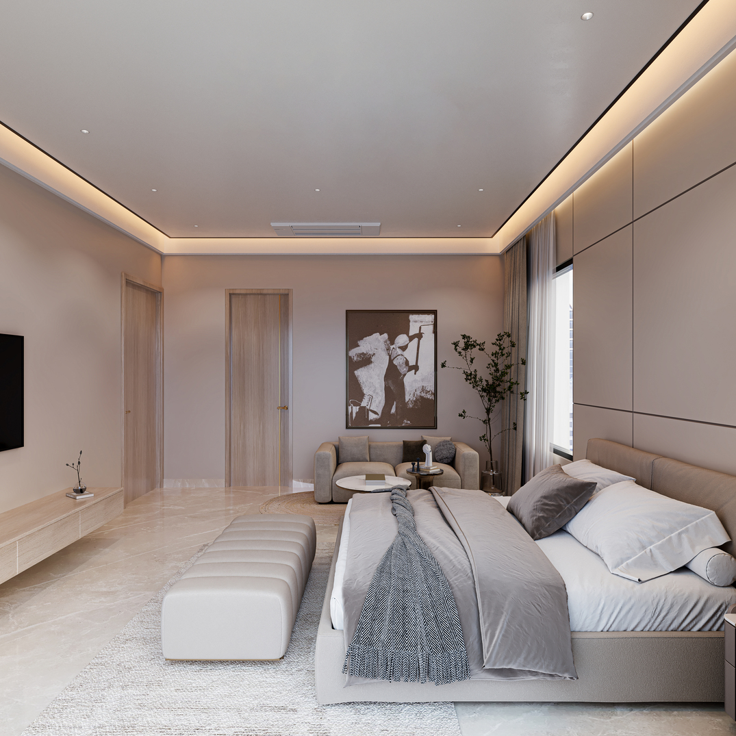 A contemporary multi-level residence that combines a clean, linear façade with deep terraces and full-height glazing to maximise views and natural light. The exterior uses soft neutral tones, layered volumes, and integrated planters to create a warm, sophisticated street presence. Inside, the apartments feature spacious bedrooms and living areas with a calm palette, indirect lighting, and sleek panelling, offering refined, comfortable everyday living.