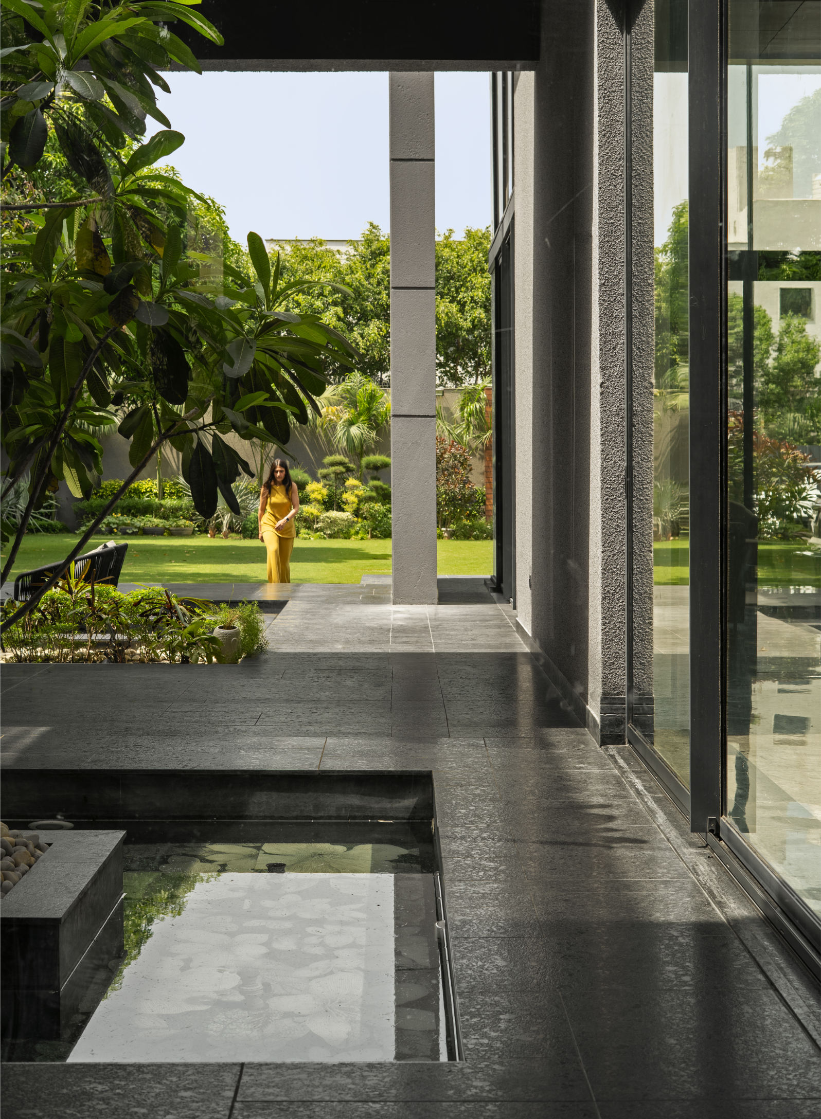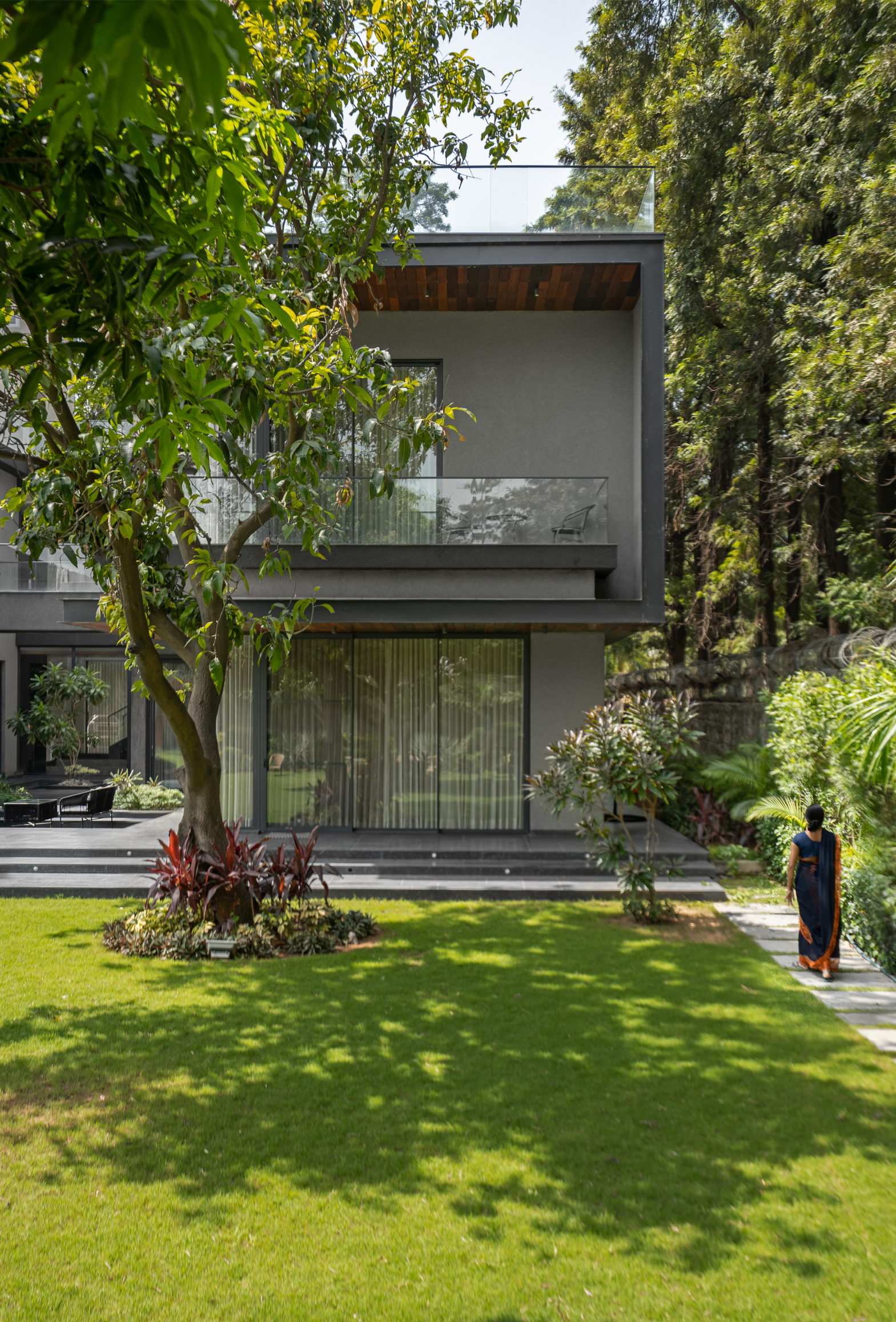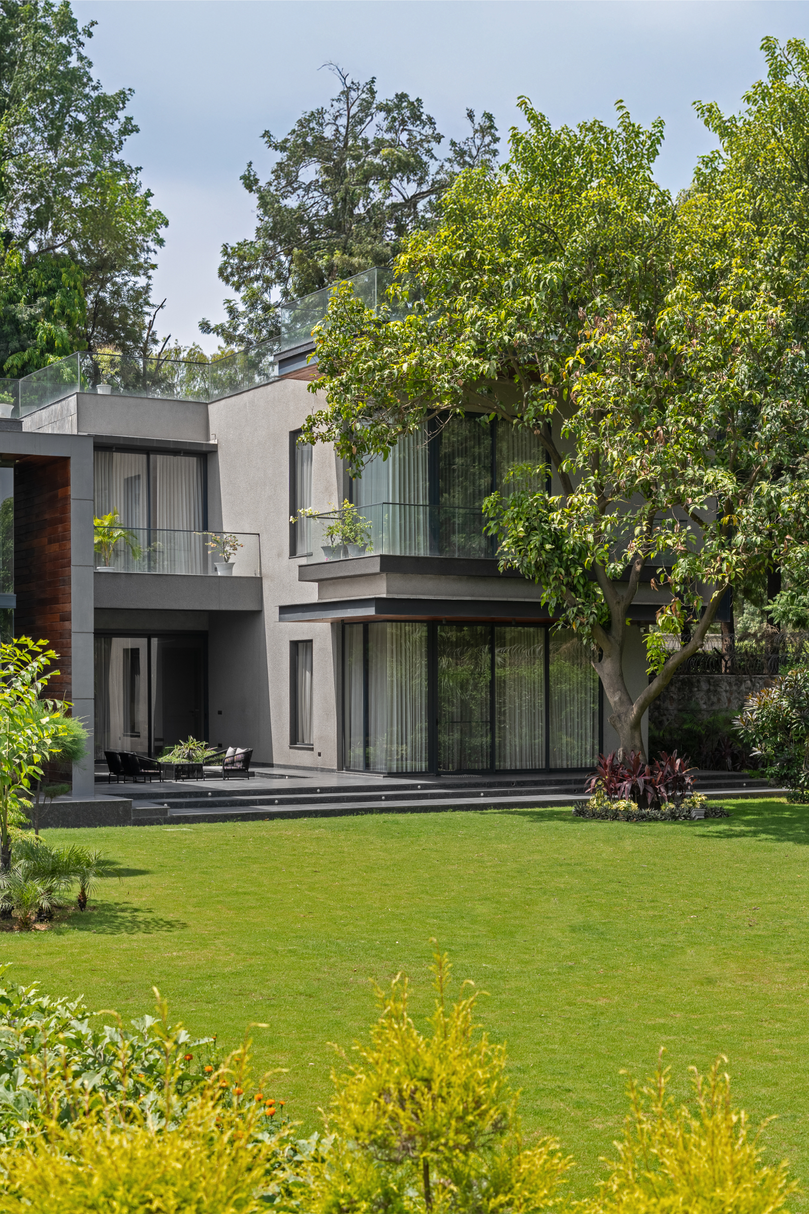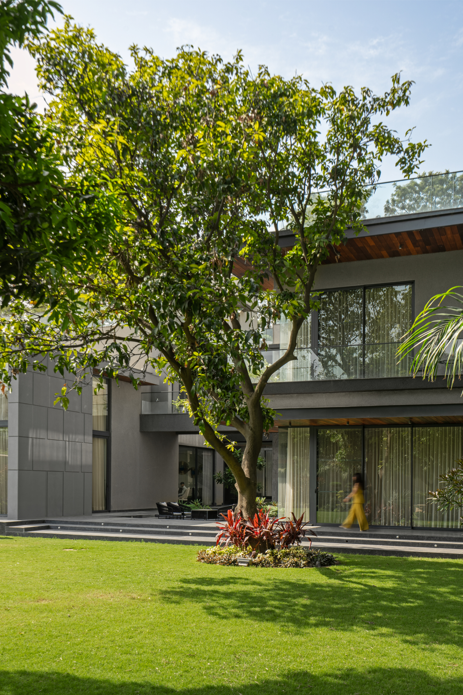 around an idyllic Plumeria tree, it gives rise to a courtyard and drives the layout of the house.Built on a half-acre plot and guided by a conscious decision to limit ground coverage, the design ensures that the built-up area remains minimal. This allows for the creation of green zones, incorporating generous backyards, landscaped gardens, and open-air decks that enhance the connection with the outdoors.