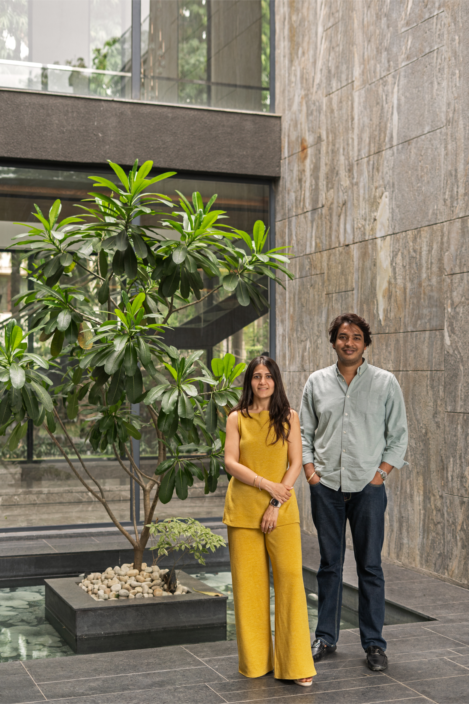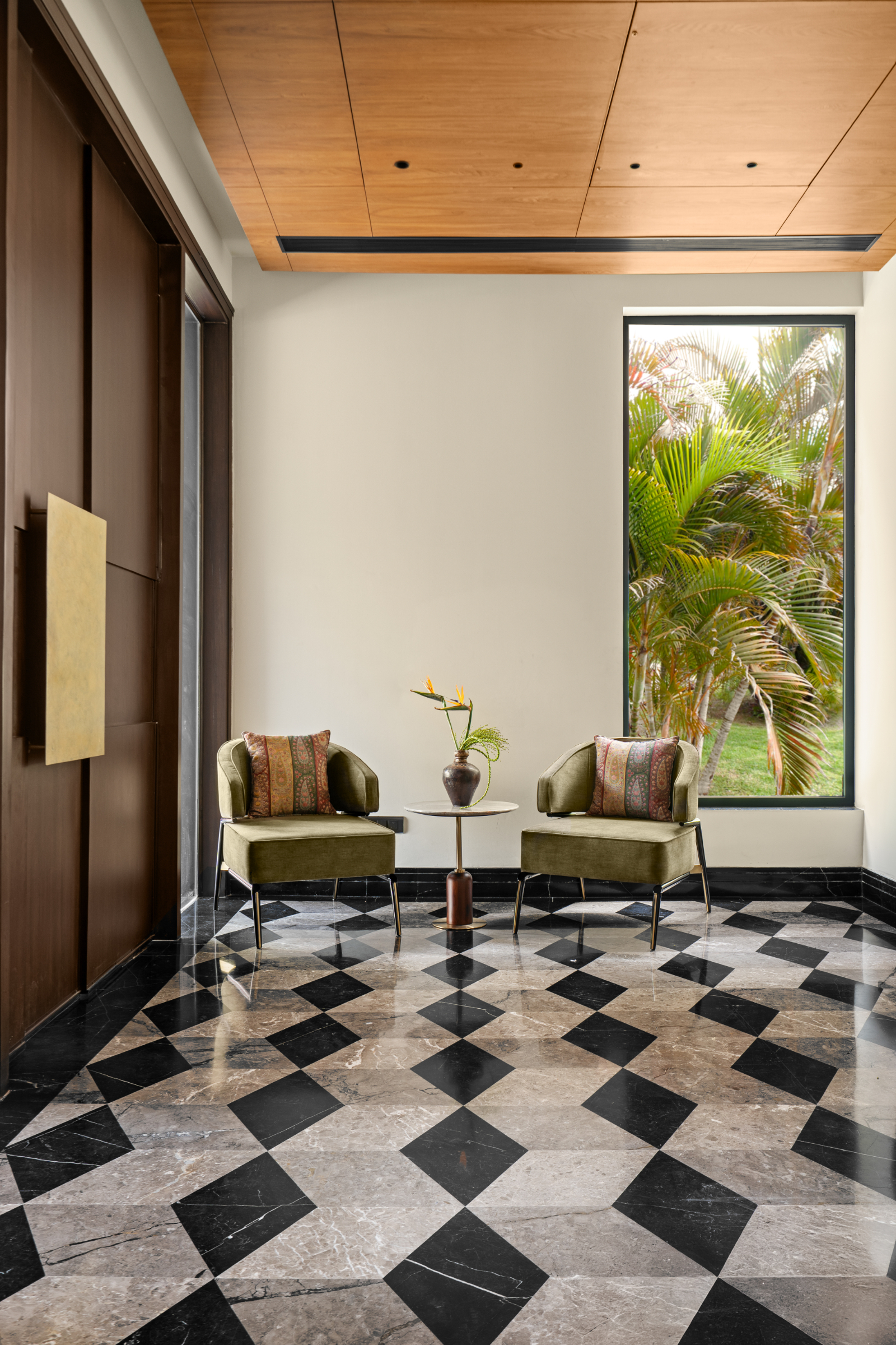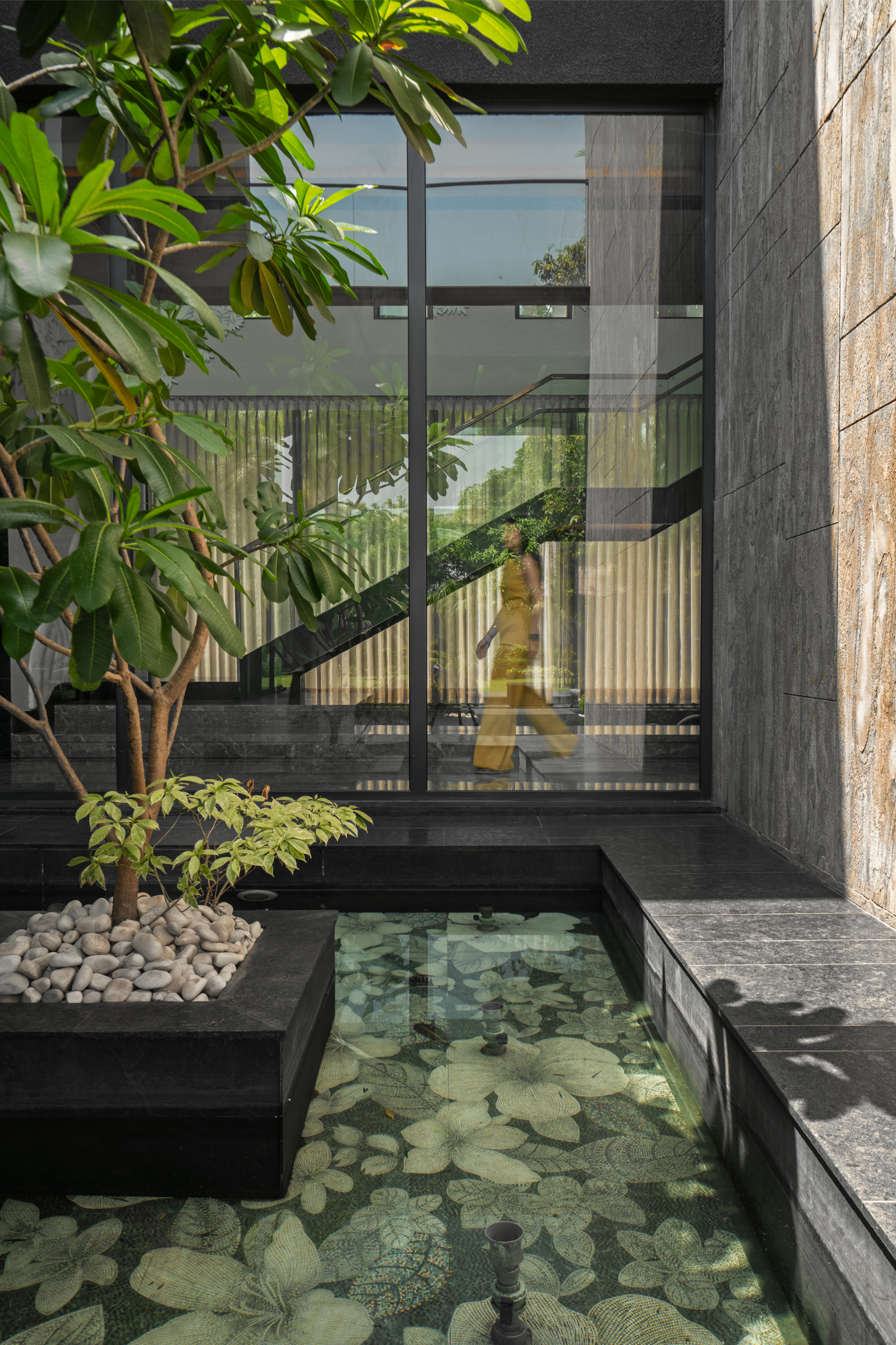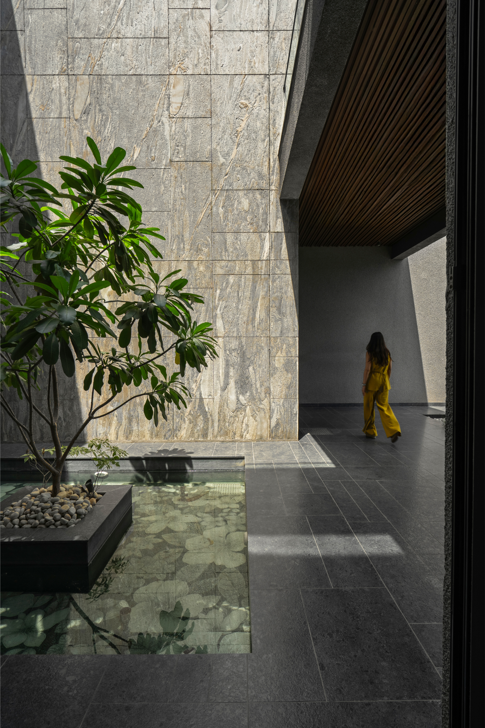 around an idyllic Plumeria tree, it gives rise to a courtyard and drives the layout of the house.Built on a half-acre plot and guided by a conscious decision to limit ground coverage, the design ensures that the built-up area remains minimal. This allows for the creation of green zones, incorporating generous backyards, landscaped gardens, and open-air decks that enhance the connection with the outdoors.