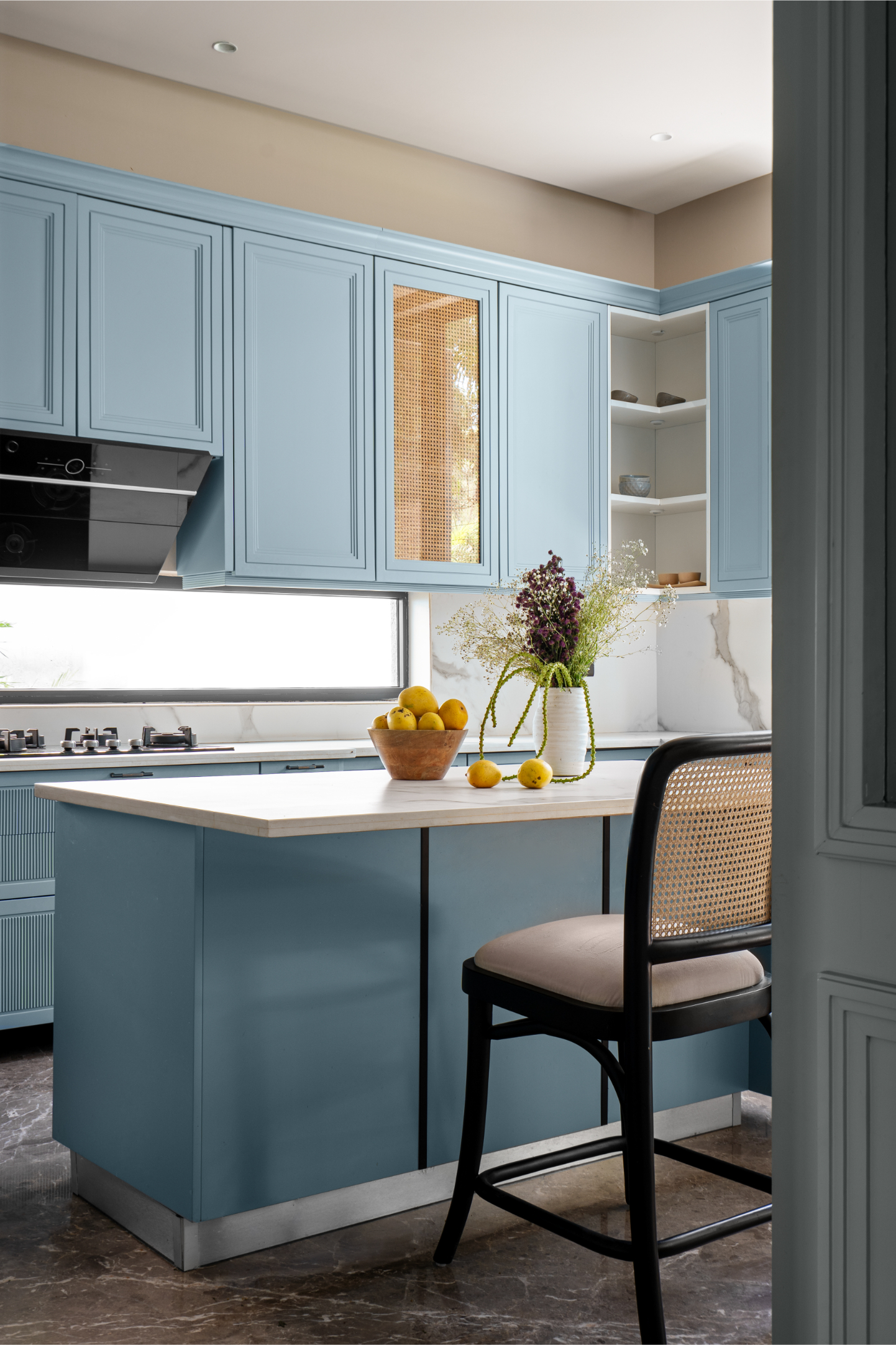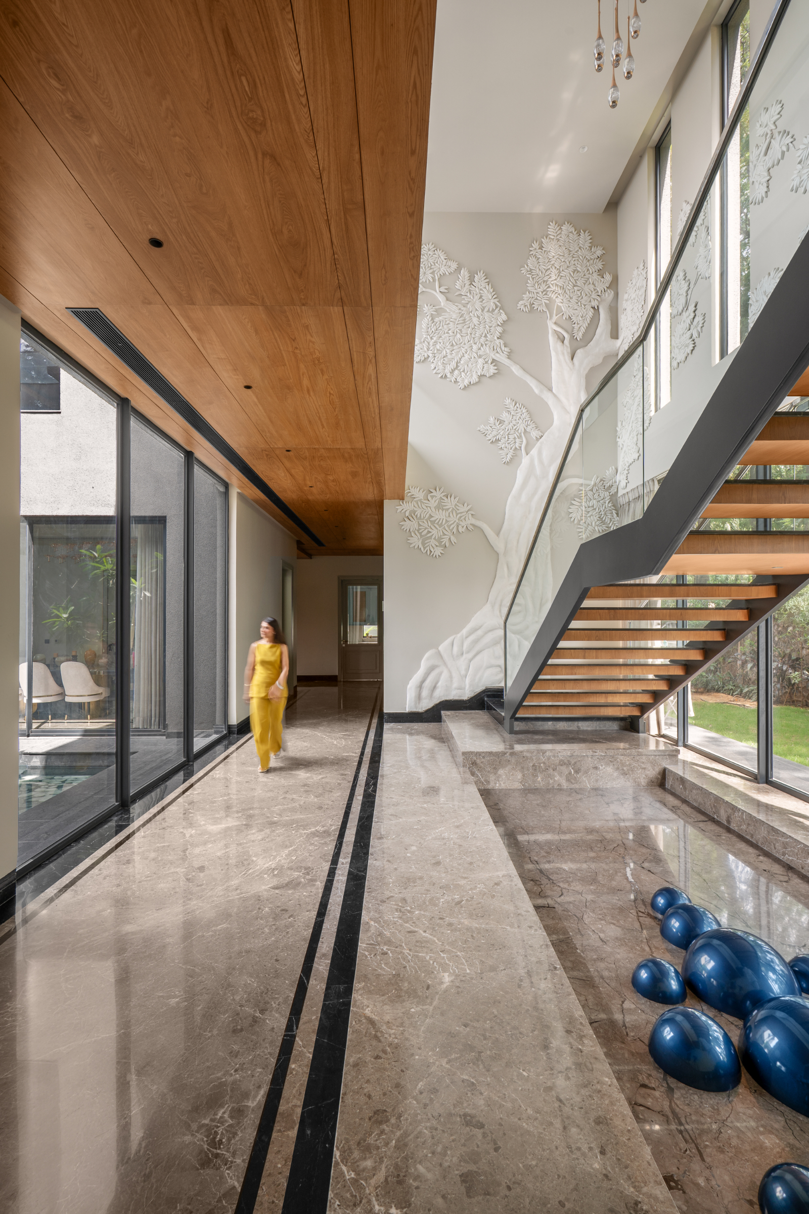 Organized across two levels, the ground floor is curated for the parents while the upper level caters to the son’s lifestyle. Entertainment areas are distributed across both levels, ensuring both connectivity and independence. Vastu principles shape the planning with harmony and balance, while natural light is drawn in through large north and east-facing openings. A double-height living area with neutral hues, wooden ceilings, and floor-to-ceiling glazing enhances the openness, while a sculptural staircase adds verticality. Subtle grey finishes punctuated with bold royal blue accents create a dramatic focal point within the interiors.