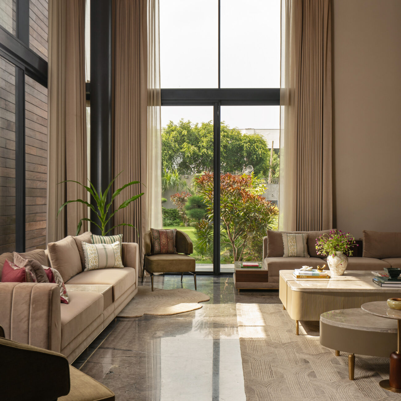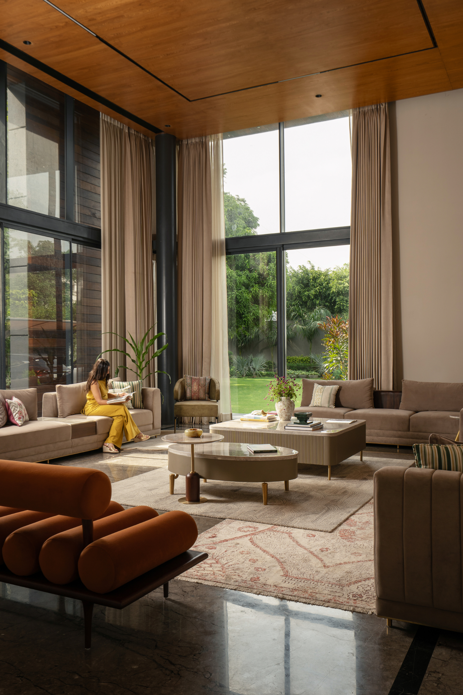 Zoned across two levels with clear functional zoning: the ground floor is curated for the parents, while the first floor is tailored to the son’s lifestyle. The spatial planning ensures that the entertainment spaces are thoughtfully distributed across both levels to maintain connectivity yet allow independence. Vastu plays a vital role in shaping the spatial layout, guiding the planning with intention and harmony. Natural light is a key consideration, with ample north and east light flooding into the interiors. Moving indoors is the double-height living area with large floor-to-ceiling windows, draped in neutral hues and wooden ceilings, which associate a connection with nature. The staircase towards the south brings a sense of verticality with its minimal design. Beneath a sculpture in grey and bold royal blue tones add a pop of colour adds to the neutral space